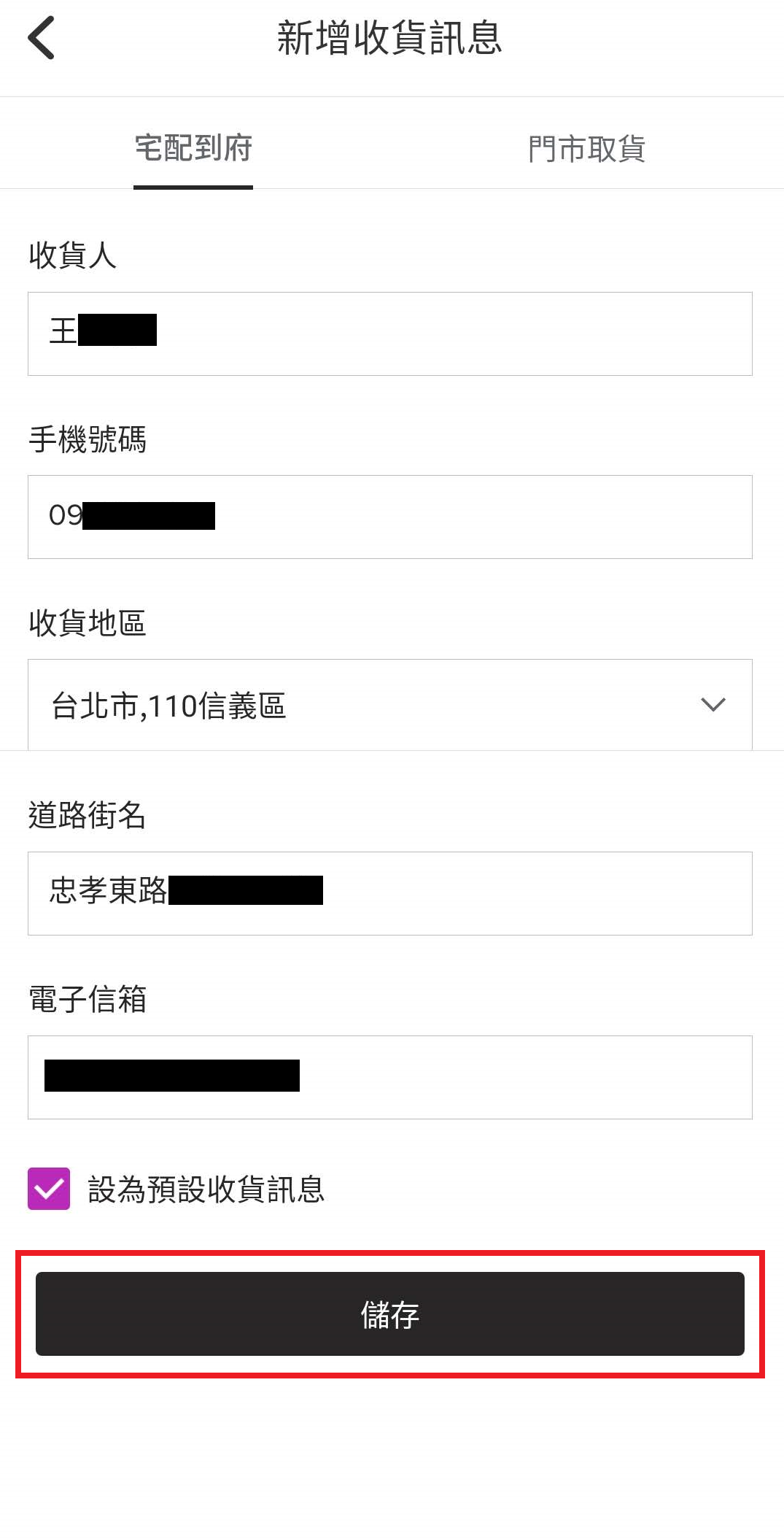 ※ 小提醒:如勾選「設為預設收貨訊息」,系統將於下次購物時,自動帶出該筆收取貨訊息喔!