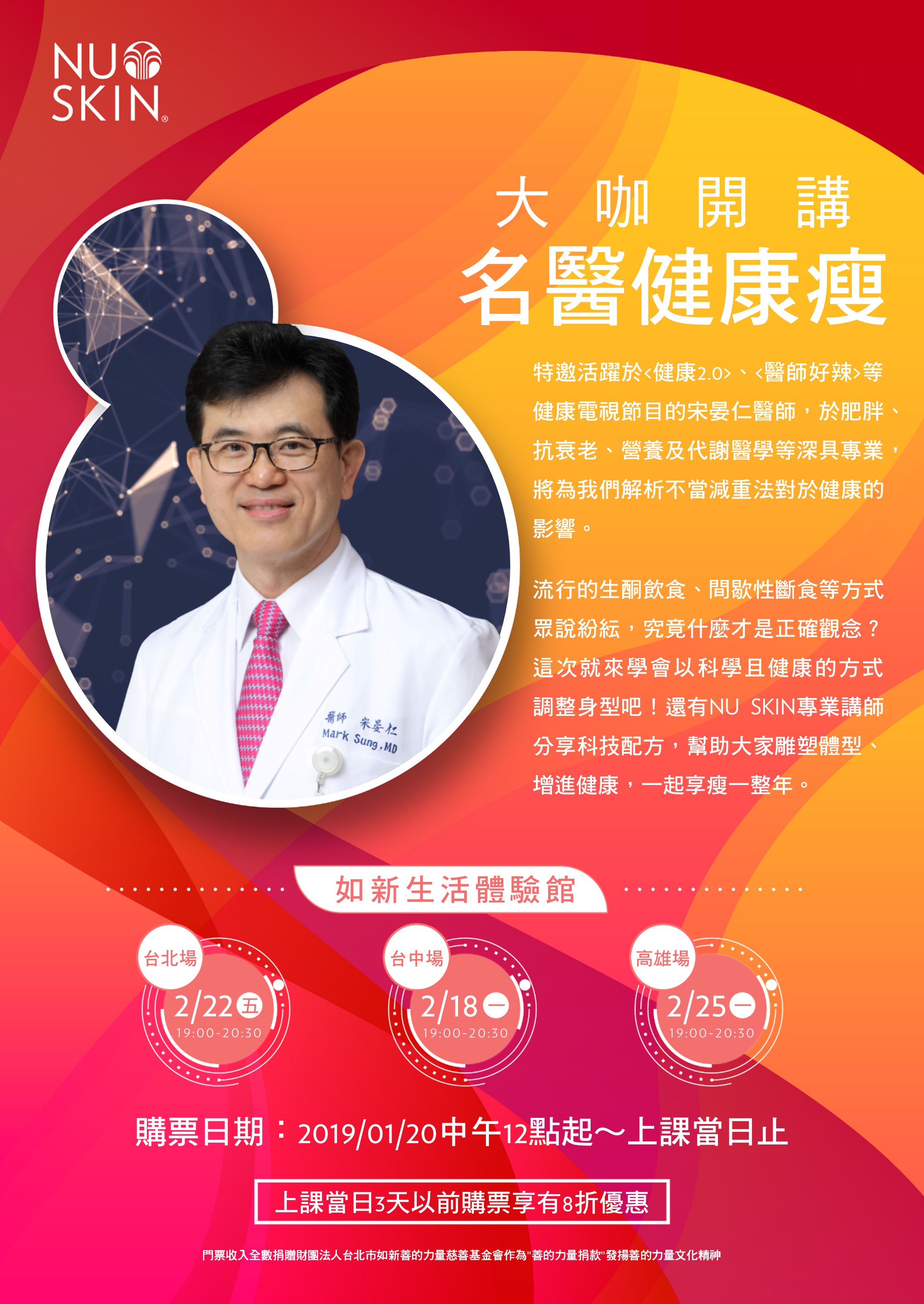 本次邀請到活躍於<健康2.0>、<醫師好辣>等健康電視節目的宋晏仁醫師,將透過他於肥胖醫學、抗衰老醫學、營養及代謝醫學的專業,為我們解析不當減重法對於健康的影響,這次就來學會以科學且健康的方式調整身型吧!另外,還有 NU SKIN 專業講師分享科技配方,幫助大家雕塑體型、增進健康,一起享瘦一整年。