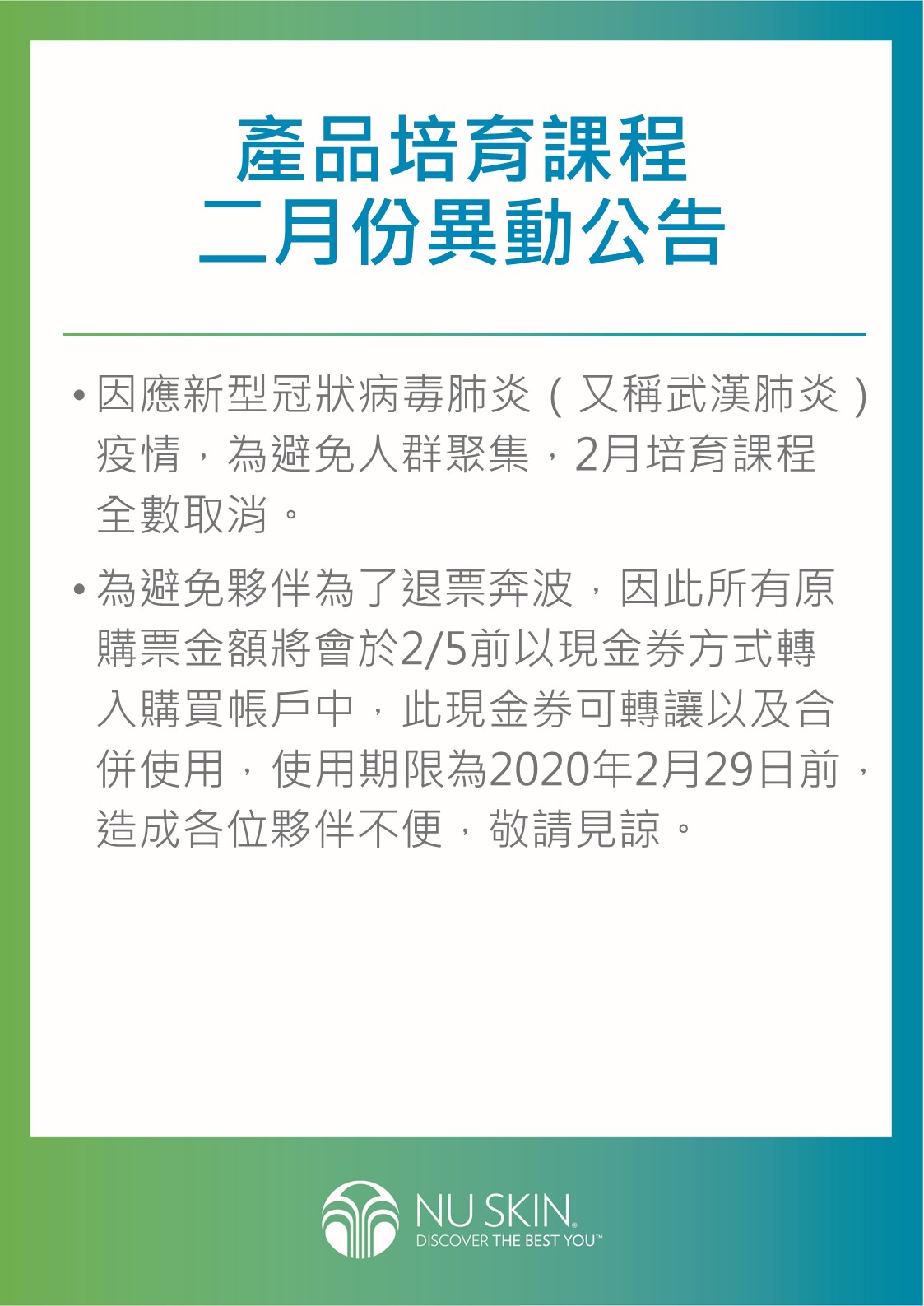 因應新型冠狀病毒疫情,2月份培育課程將全數取消,相關退費請詳閱公告內容,