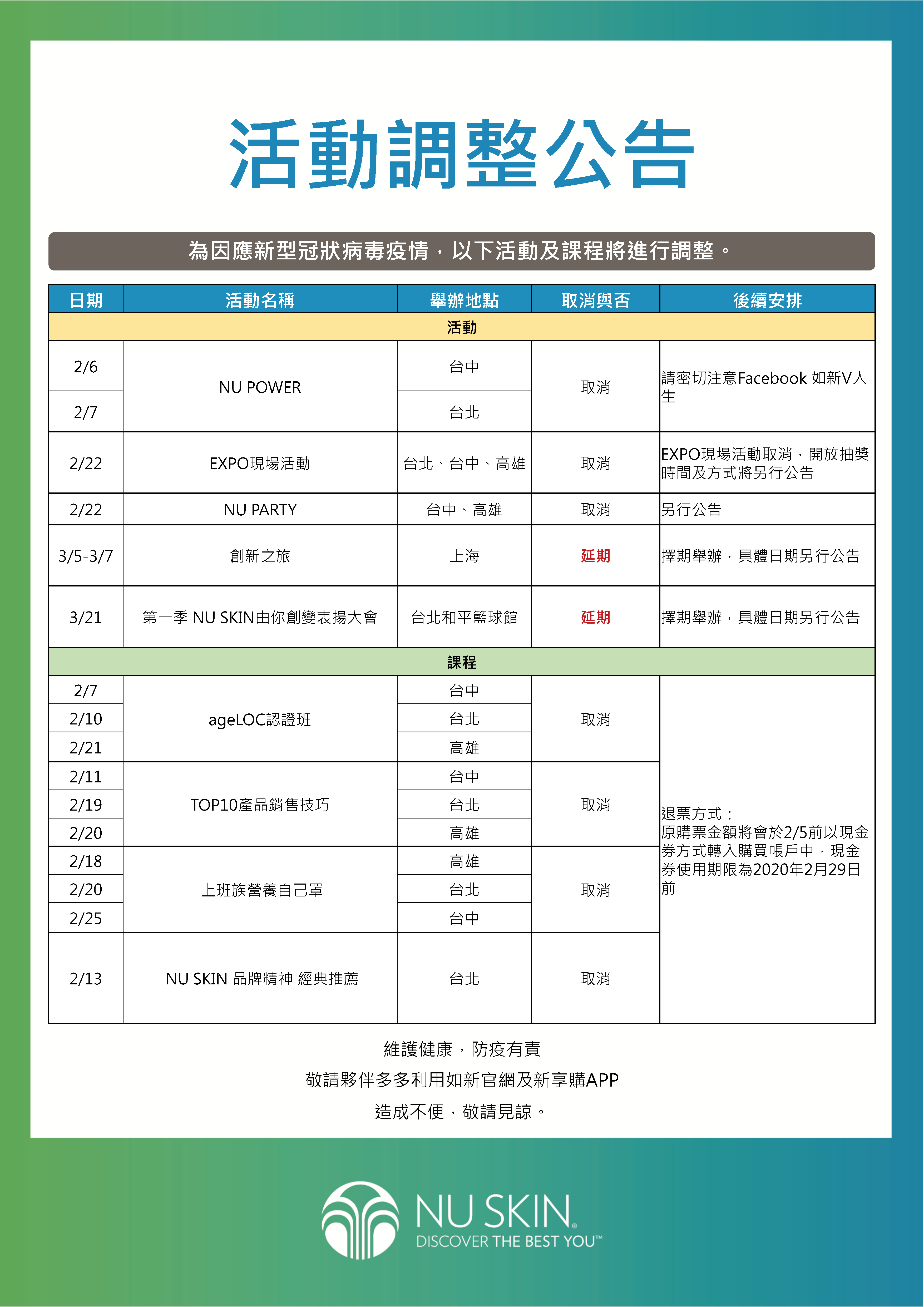 因應新型冠狀病毒疫情,並考量到大家的健康安全,故2~3月活動異動如下,不便之處,敬請原諒!