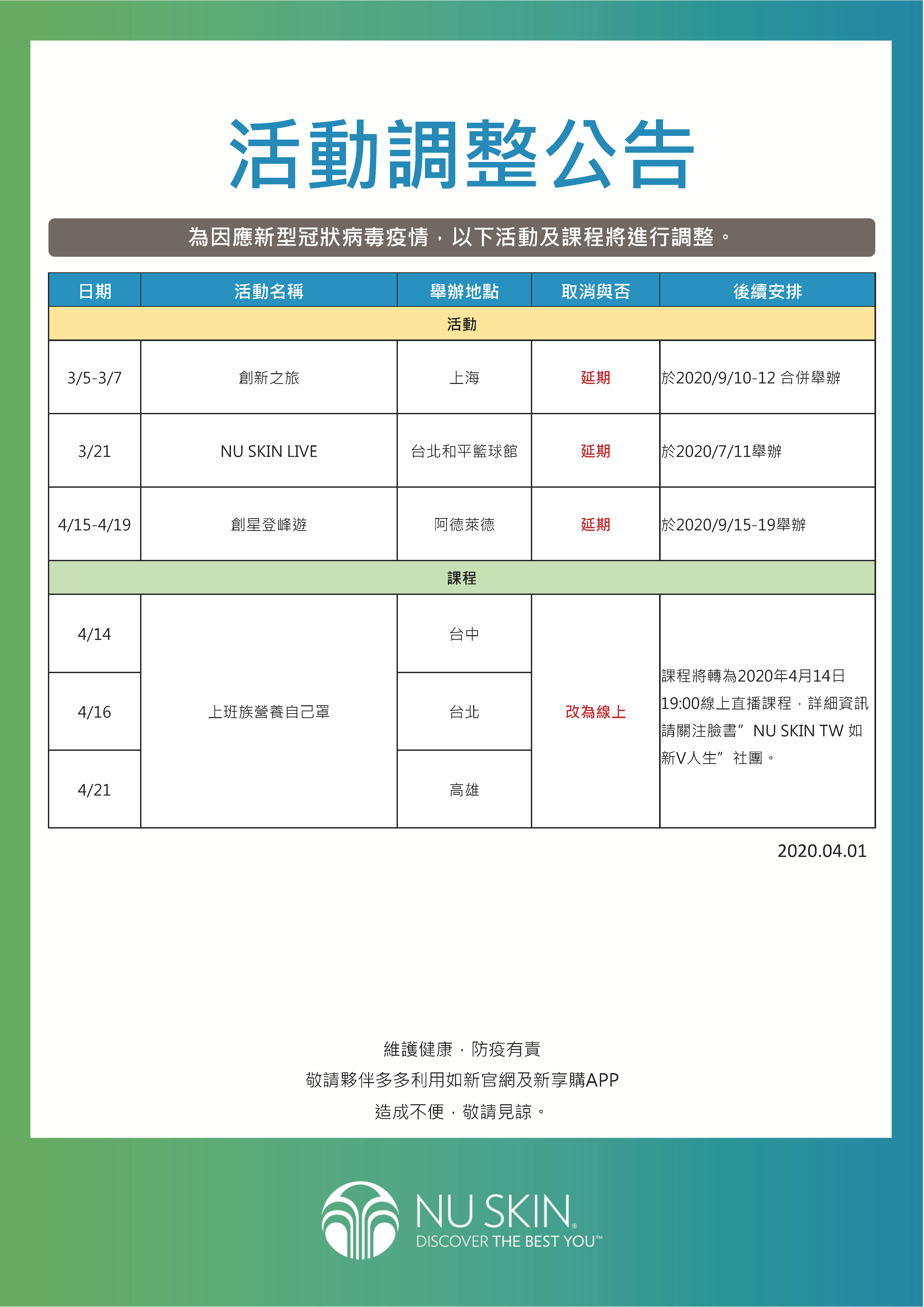 因應新型冠狀病毒,4月公司活動統整更新如下,請各位夥伴們多多留意,並提醒身邊的朋友們唷!