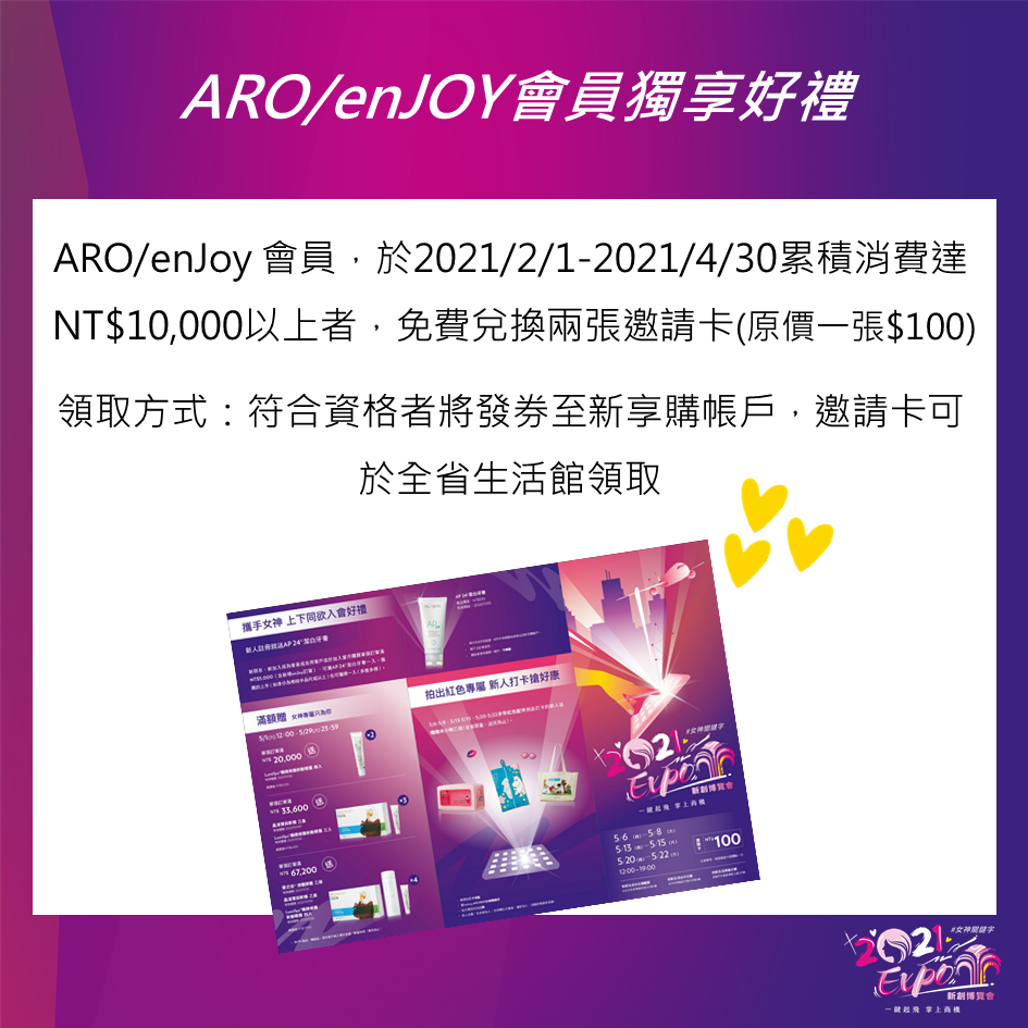 ARO/enJoy會員於2021/2/1-2021/4/30累積消費達NT$10,000以上者,免費兌換兩張邀請卡(原價一張$100)