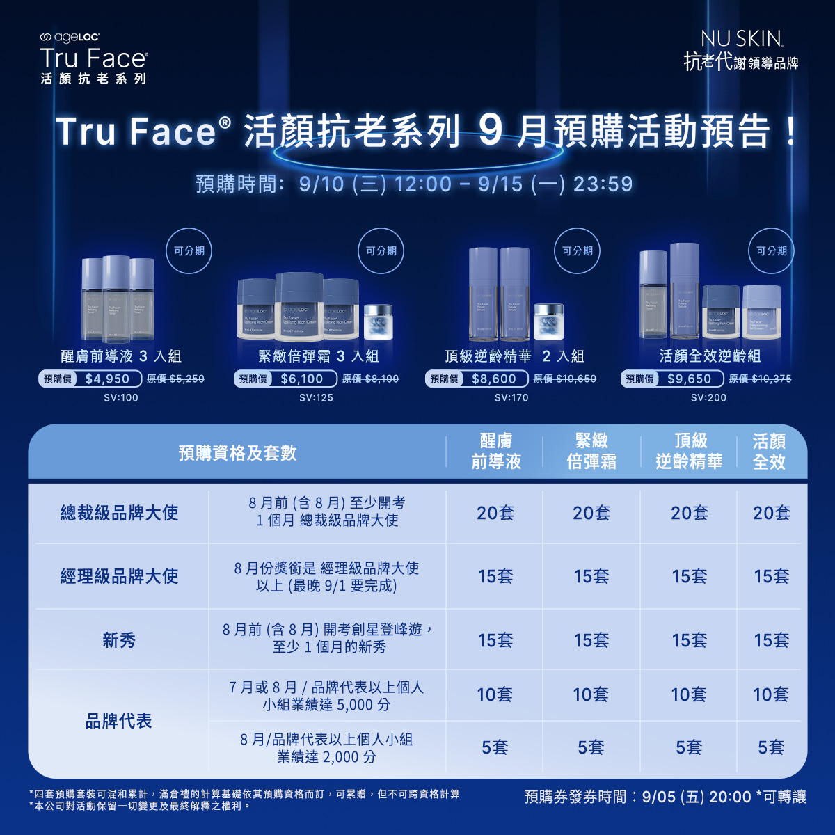 1、符合資格者將會於 2025/9/5,收到其資格對應之預購套數的 四套(如下列)活顏抗老預購套裝購買券。