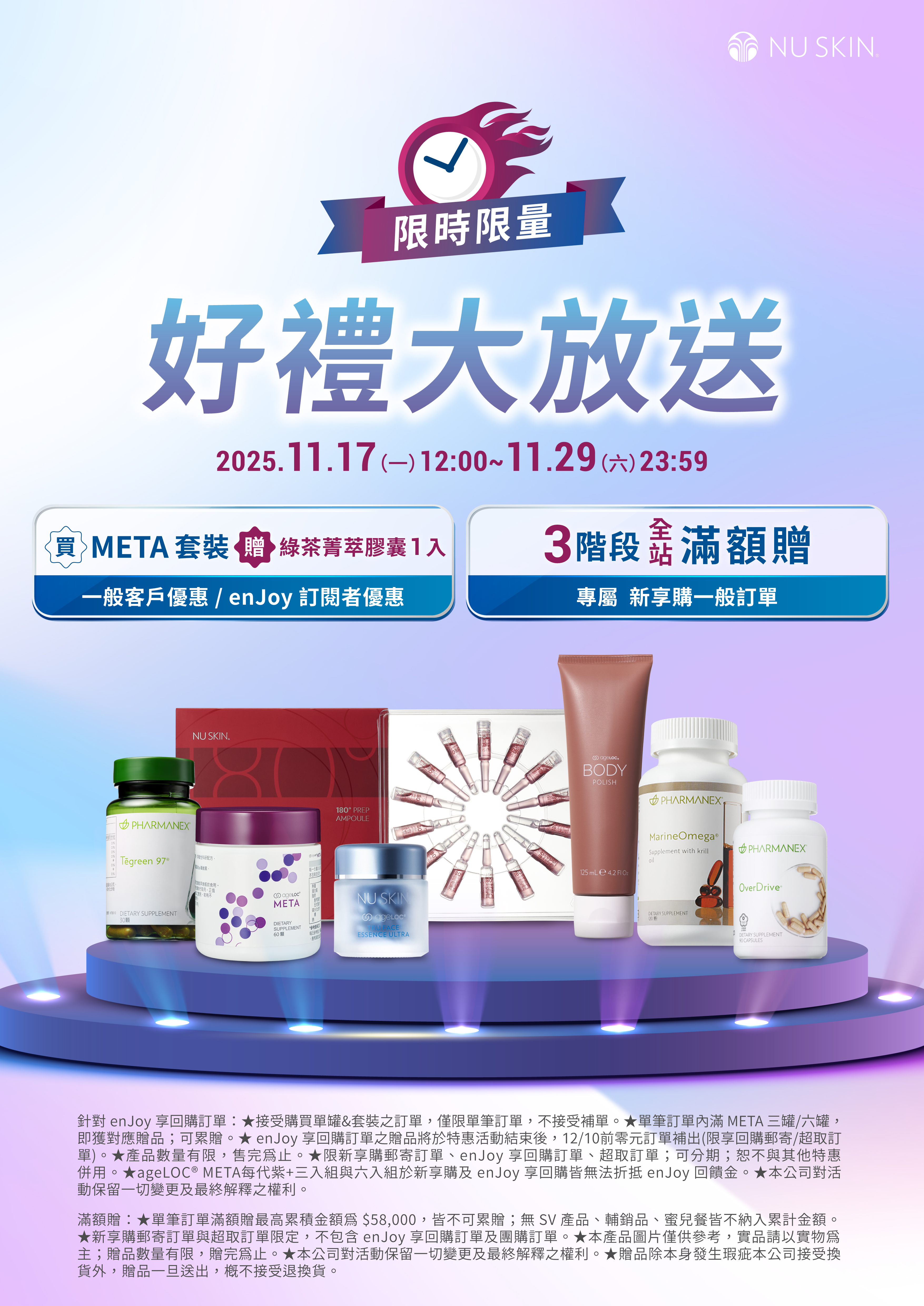 *ageLOC® META每代紫+三入組與六入組於新享購及 enJoy 享回購皆無法折抵 enJoy 回饋金。