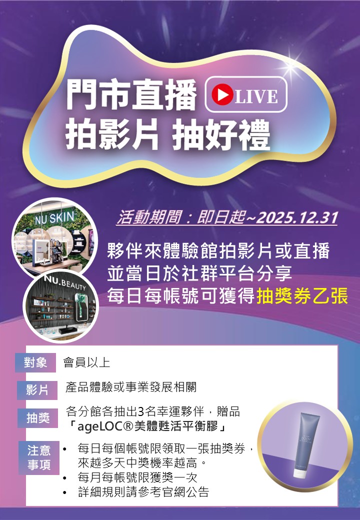 🔈夥伴來體驗館直播或拍影片,並於當日於社群平台分享,每日每帳號可獲得抽獎券乙張
