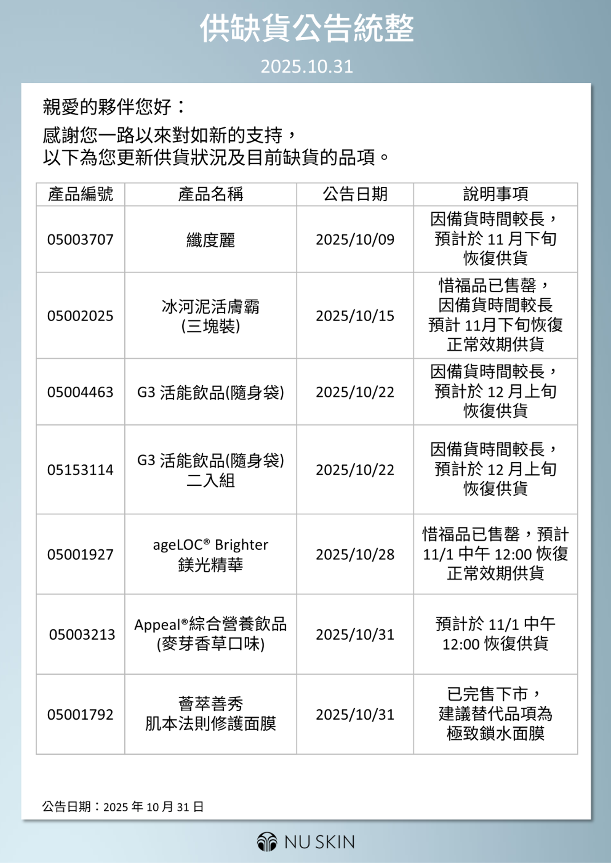 供缺貨公告統整 2025.10.31 (薈萃善秀 肌本法則修護面膜 下市)