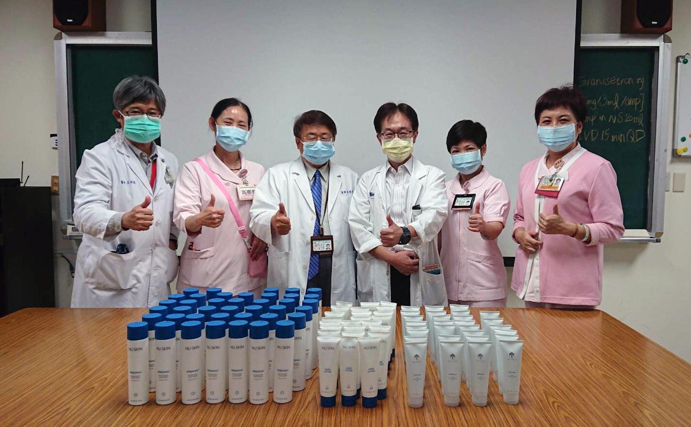 Nu Skin 關懷辛苦守護台灣的醫療人員,捐贈1000瓶「潤手露、水潤滋養身體乳、蘆薈潤膚膠」至臺北榮民總醫院、林口及高雄長庚醫院、成大醫院、台大兒童醫院、高雄醫學大學附設醫院、台中榮總、心臟病兒童基金會等北中南超過8個醫療單位,醫護人員頻繁使用酒精消毒雙手,以 Nu Skin 優質產品為醫護人員呵護肌膚,手護辛苦的台灣守護者!