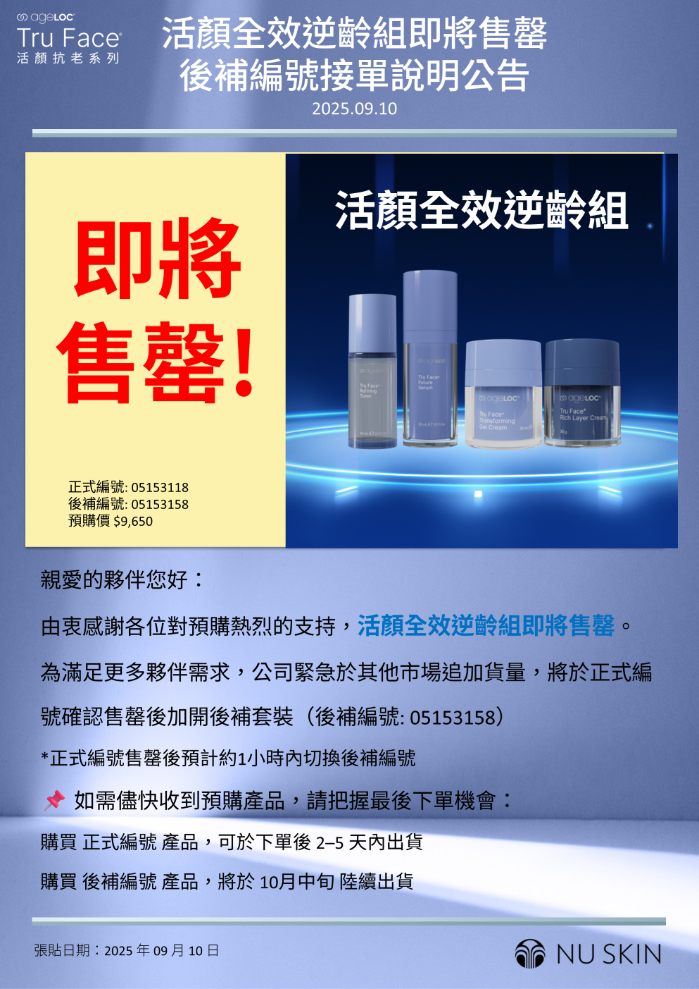 Tru Face 活顏全效逆齡組即將售罄 候補編號接單說明公告 2025.09.10