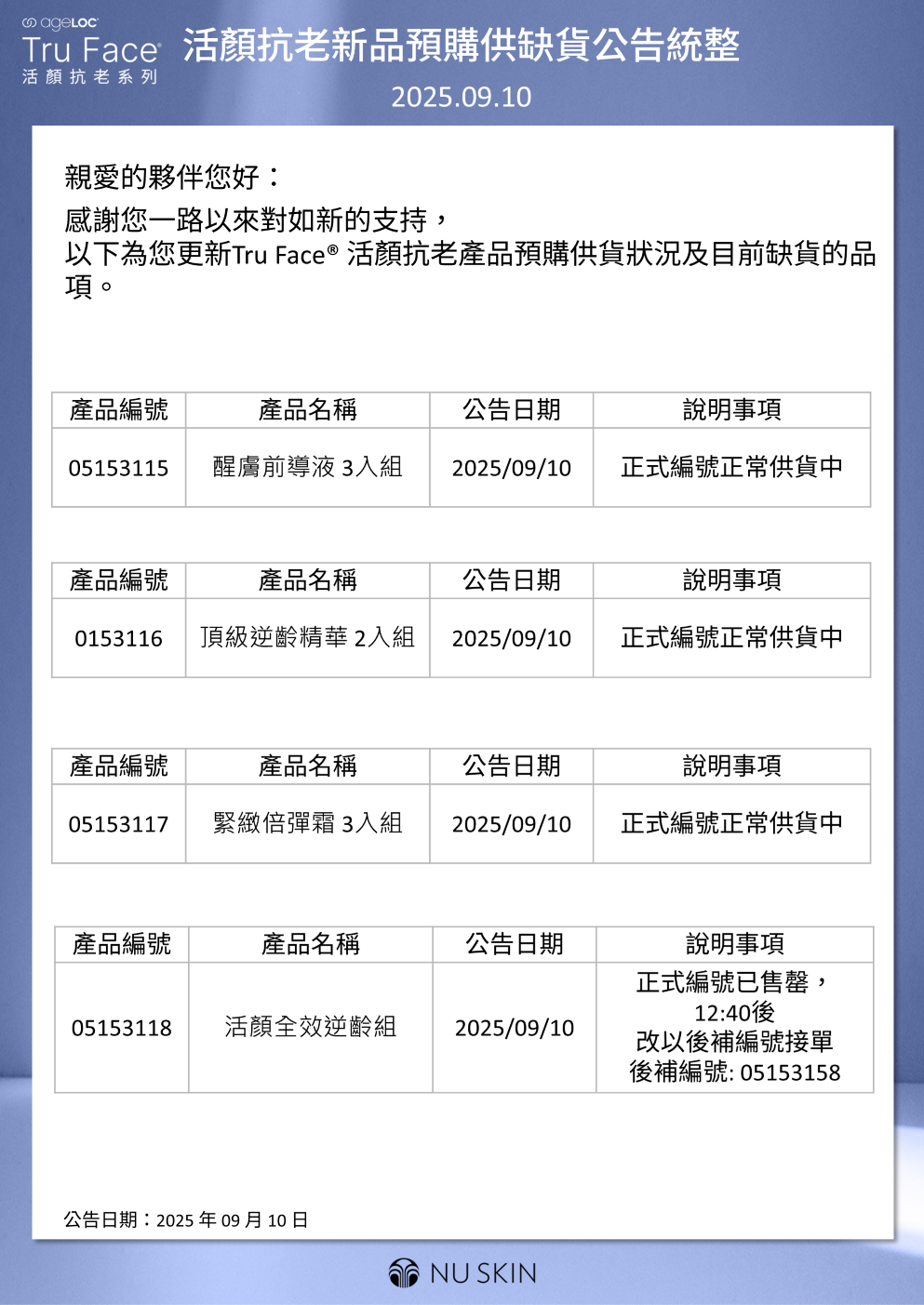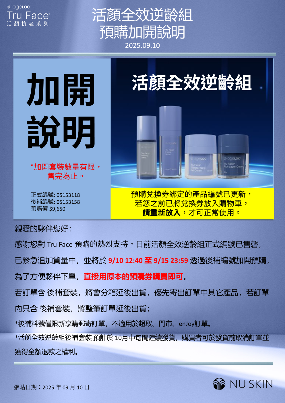 Tru Face 活顏全效逆齡組即將售罄 候補編號接單說明公告 2025.09.10
