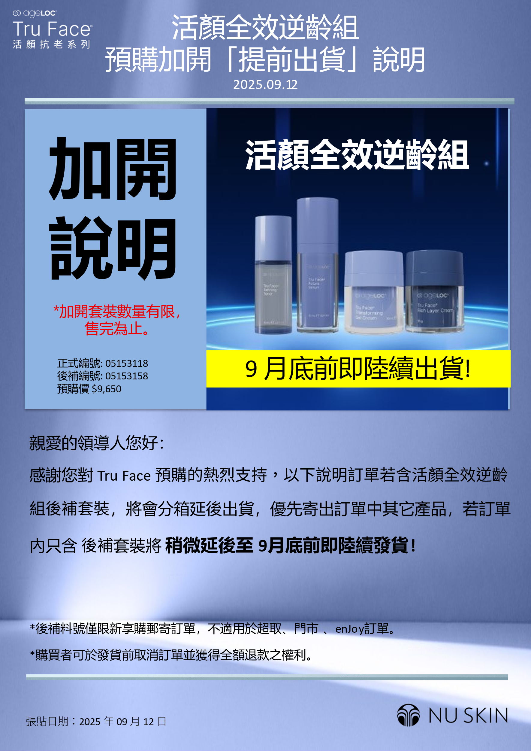 Tru Face 活顏全效逆齡組 預購加開「提前出貨」說明公告 2025.09.12