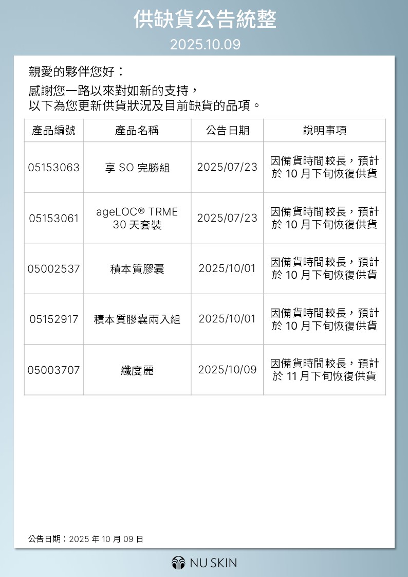 TRME 積本質膠囊相關套裝後補出貨公告 2025.10.03