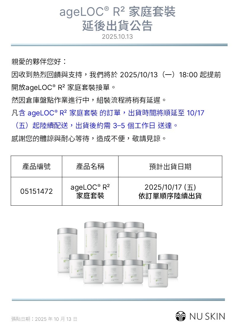 ageLOC® R² 家庭套裝延後出貨公告 2025.10.13