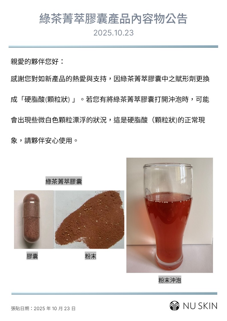 綠茶菁萃膠囊產品內容物說明公告 2025.10.23