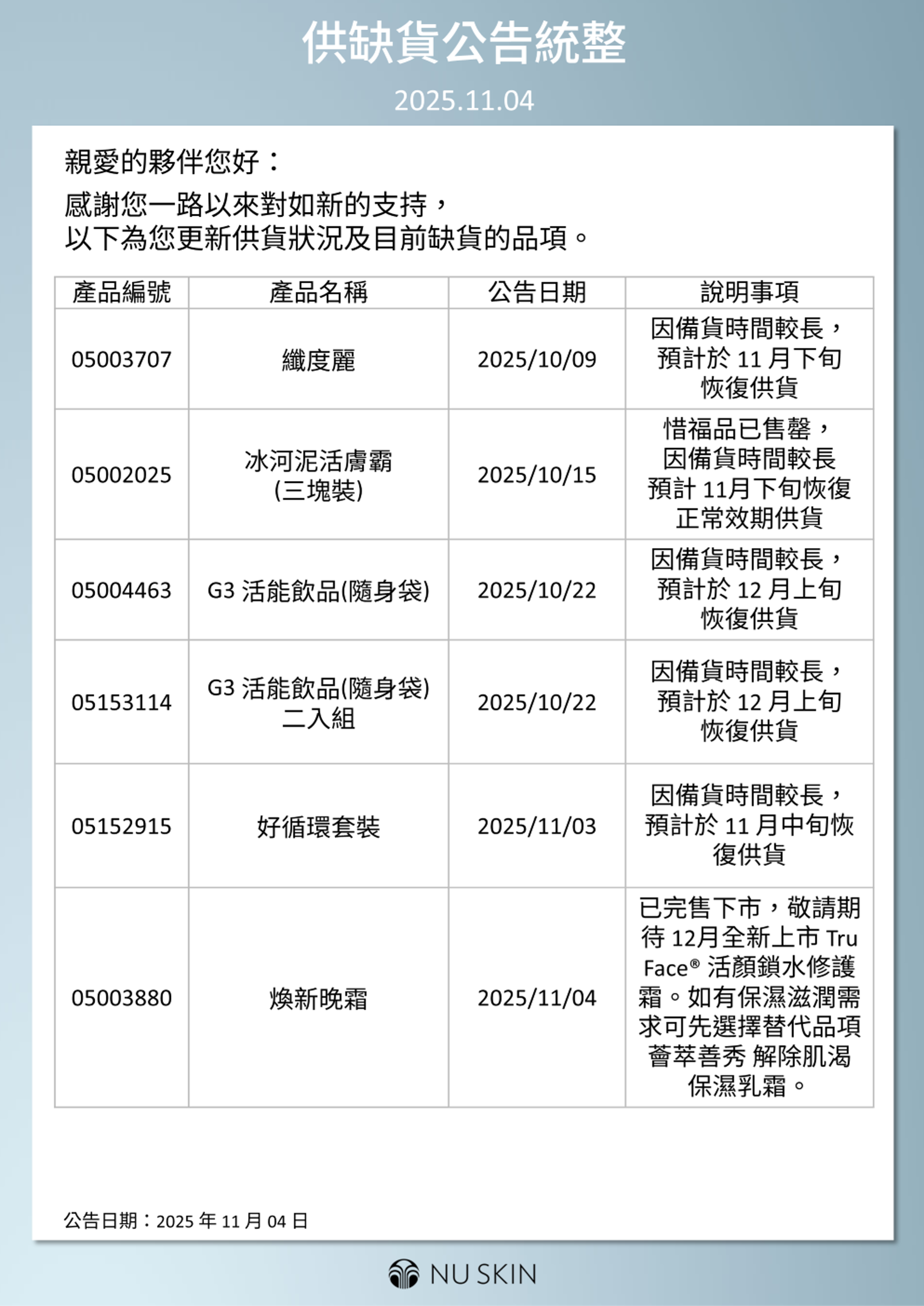 供缺貨公告統整 2025.11.04