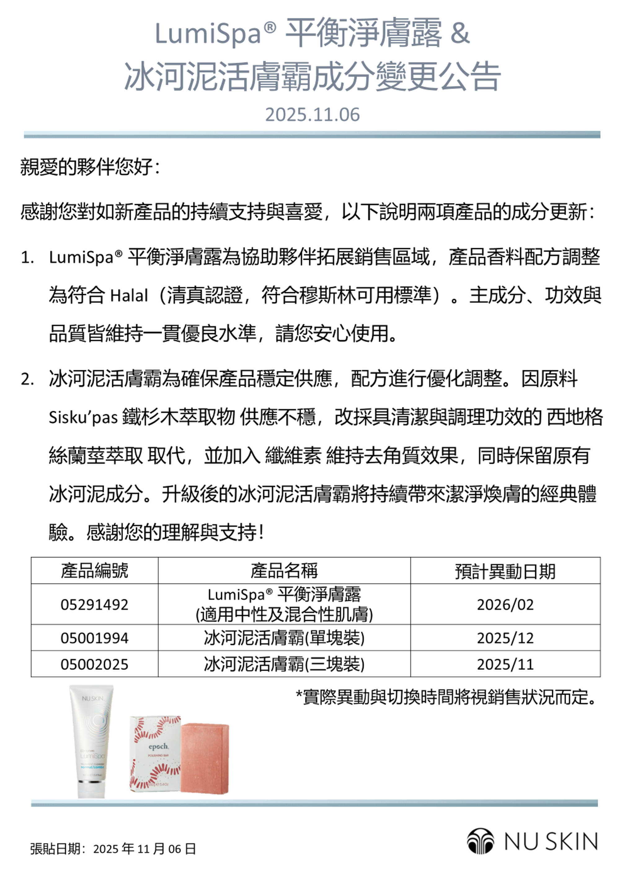 LumiSpa®平衡淨膚露與冰河泥活膚霸成分變更公告