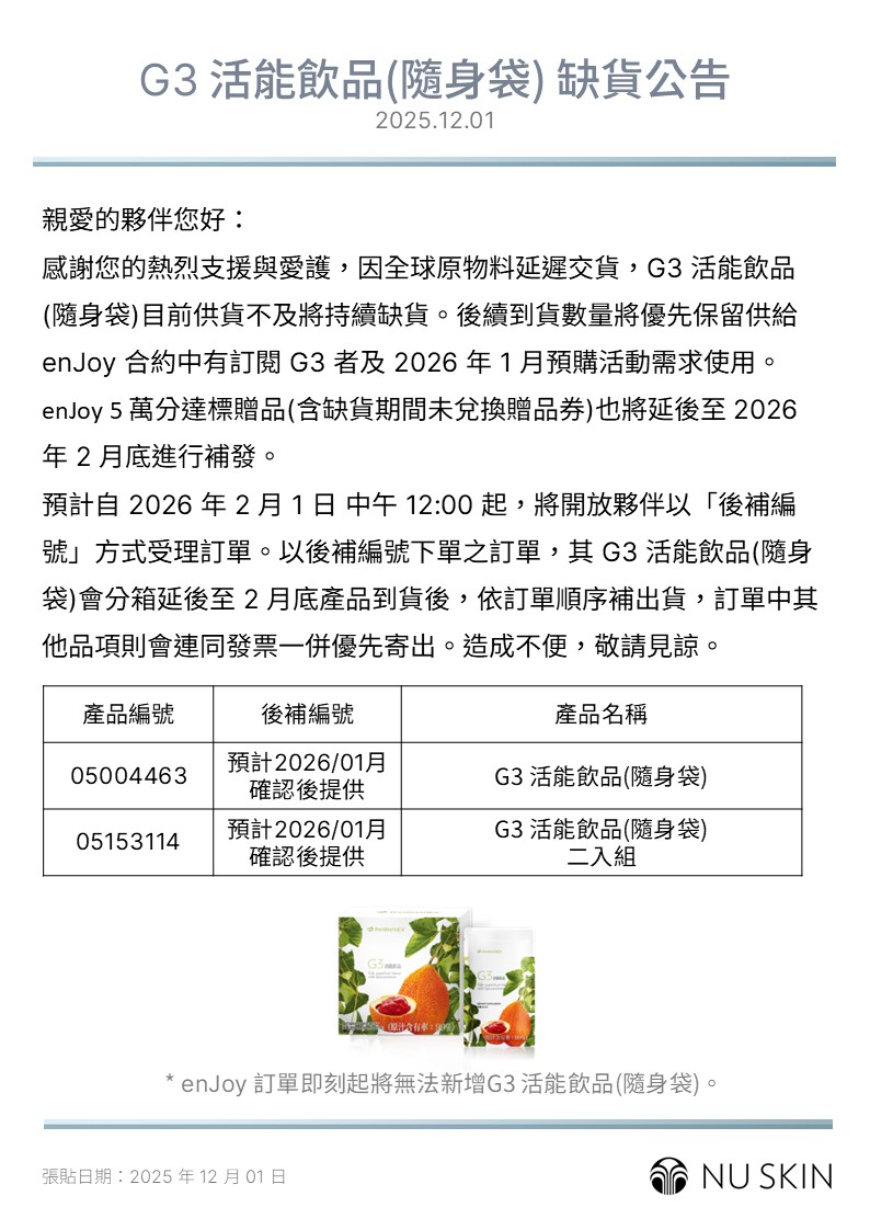 公告 - G3 活能飲品(隨身袋)缺貨公告-2025.12.01