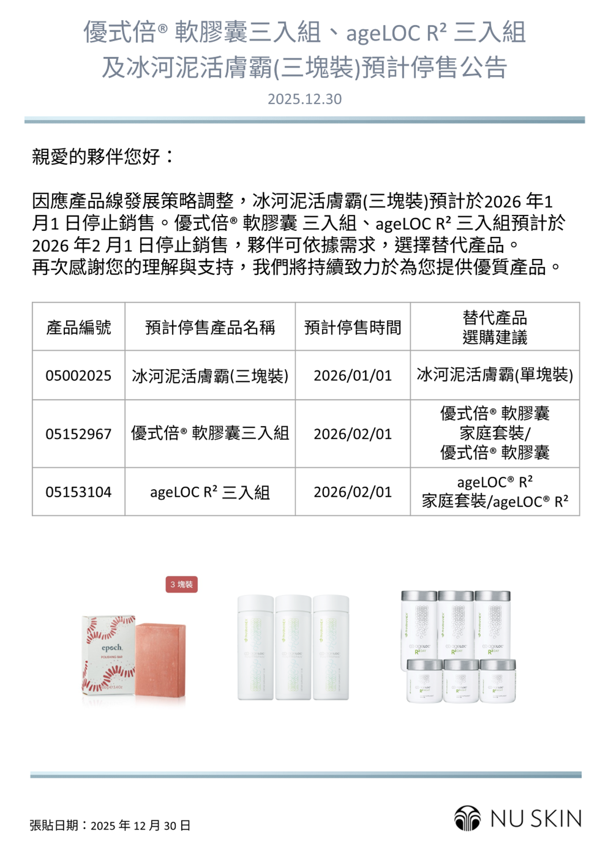 優式倍® 軟膠囊三入組、ageLOC R² 三入組及冰河泥活膚霸(三塊裝)預計停售公告