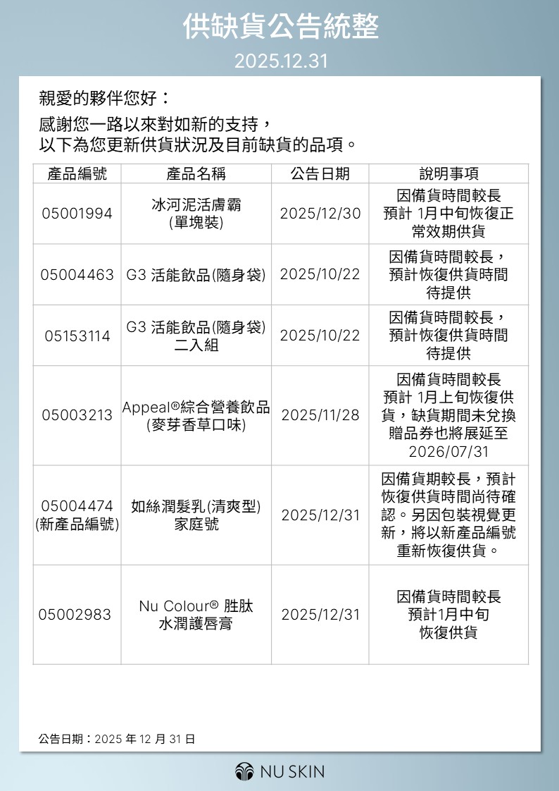 供缺貨公告統整 2025.12.31