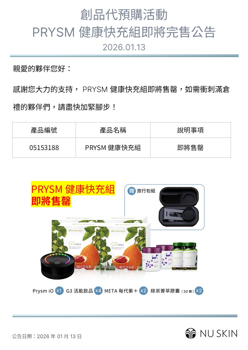 創品代預購活動 - PRYSM 健康快充組即將完售公告 2026.01.13