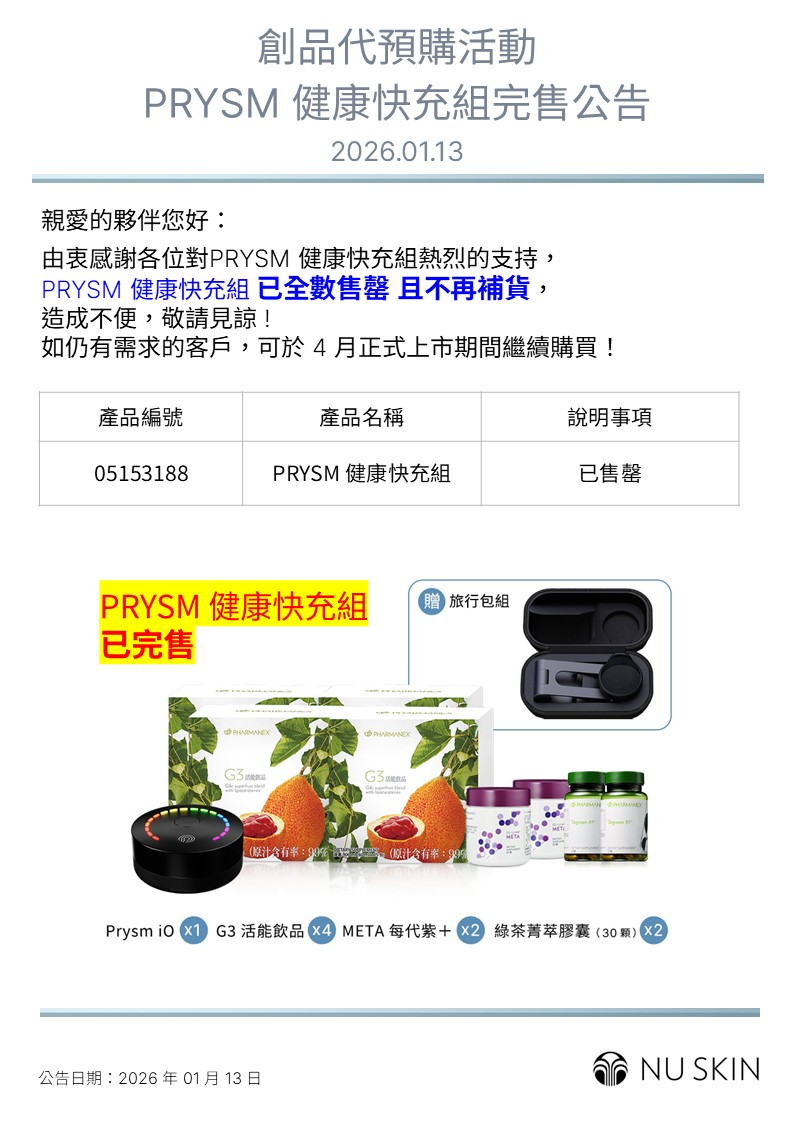 創品代預購活動 - PRYSM 健康快充組完售公告 2026.01.13