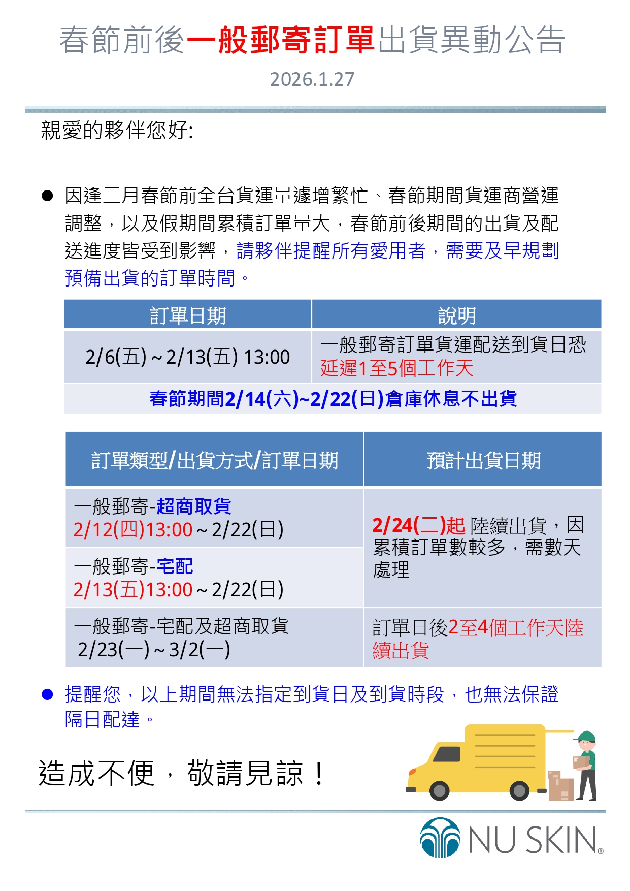 2026年2月春節前(enjoy訂單)出貨異動公告