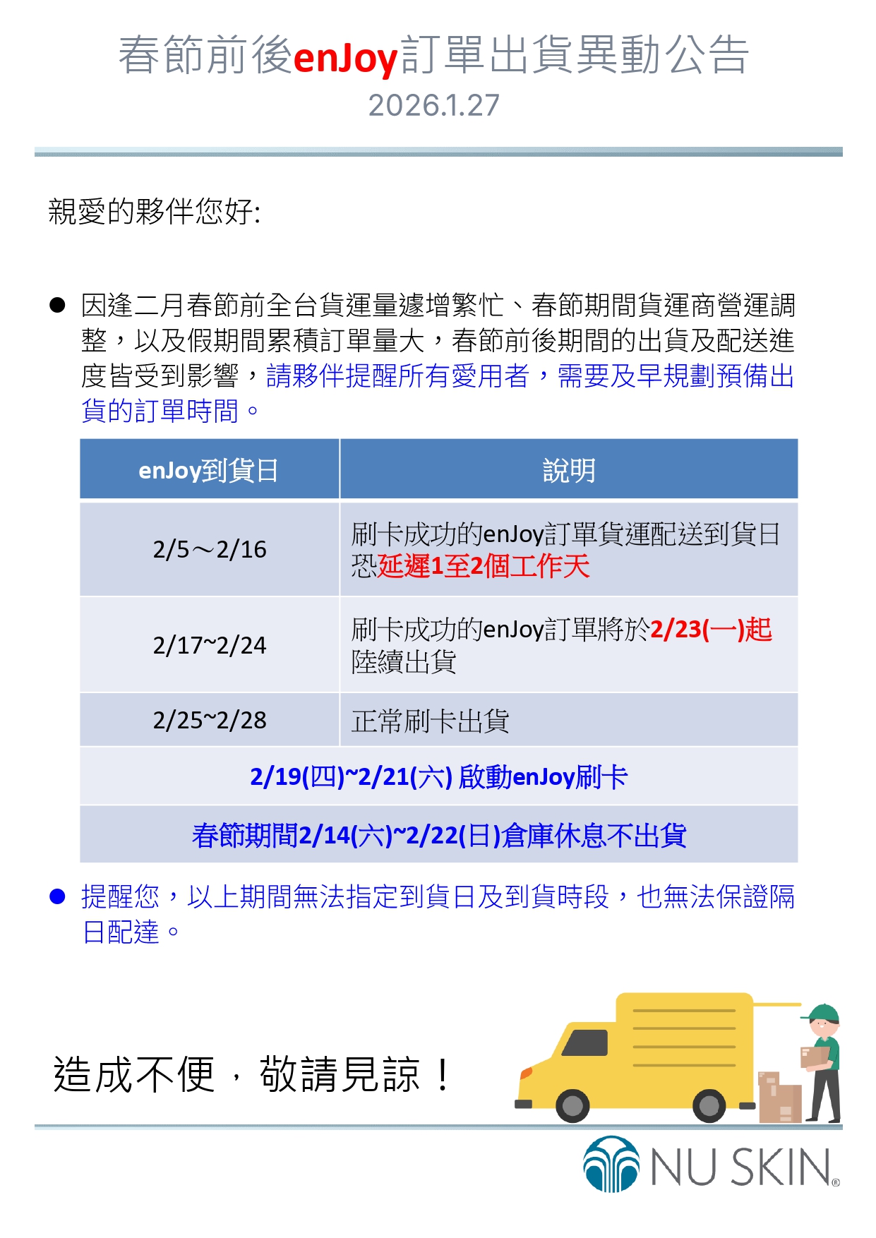 2026年2月春節前(enjoy訂單)出貨異動公告