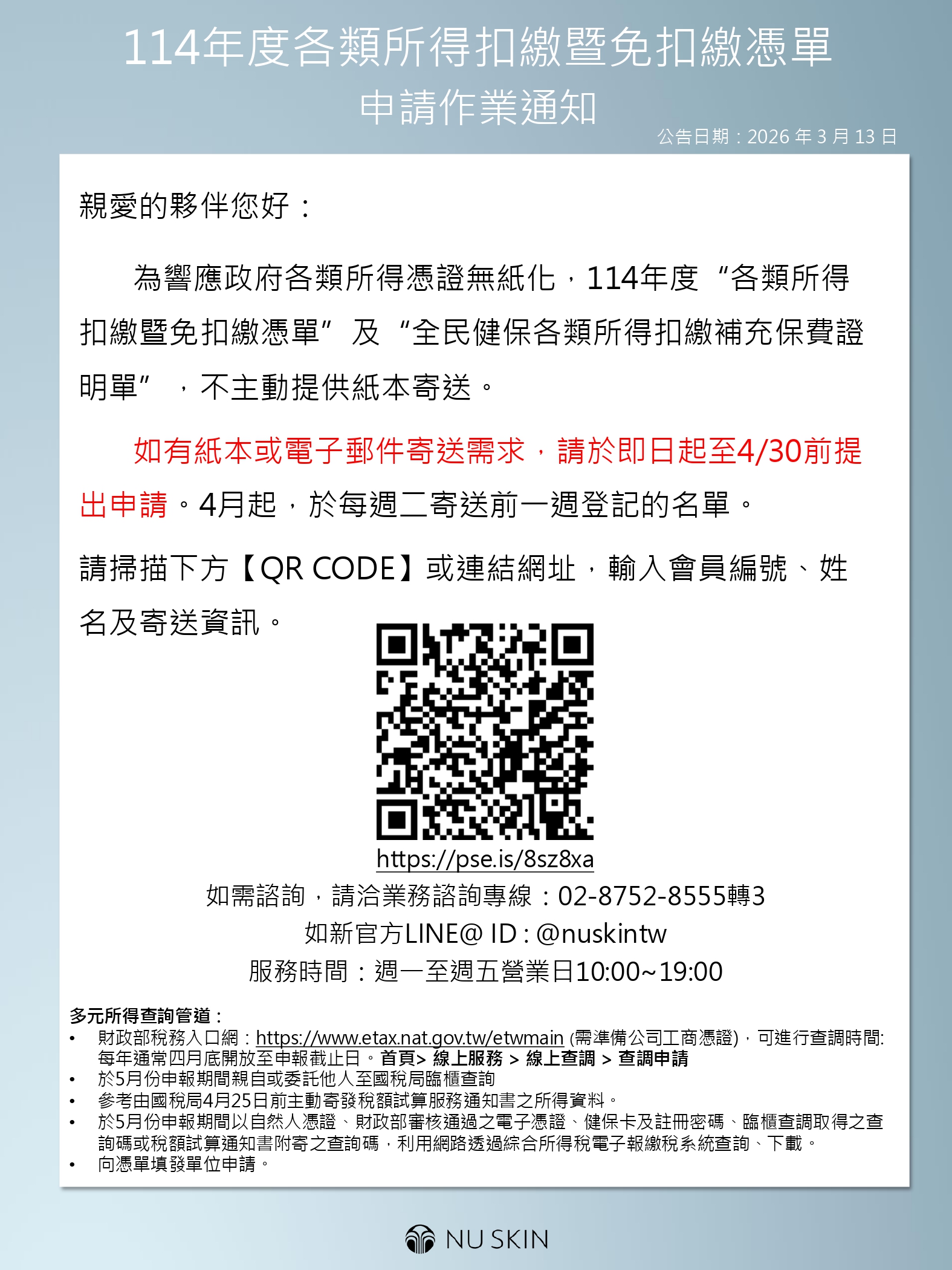 為響應政府各類所得憑證無紙化,114年度“各類所得扣繳暨免扣繳憑單”及“全民健保各類所得扣繳補充保費證明單”,不主動提供紙本寄送。