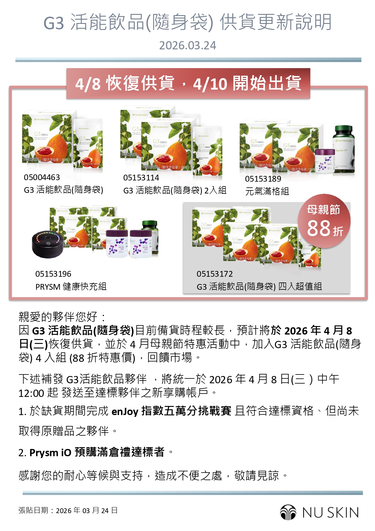 G3 活能飲品(隨身袋) 供貨更新說明