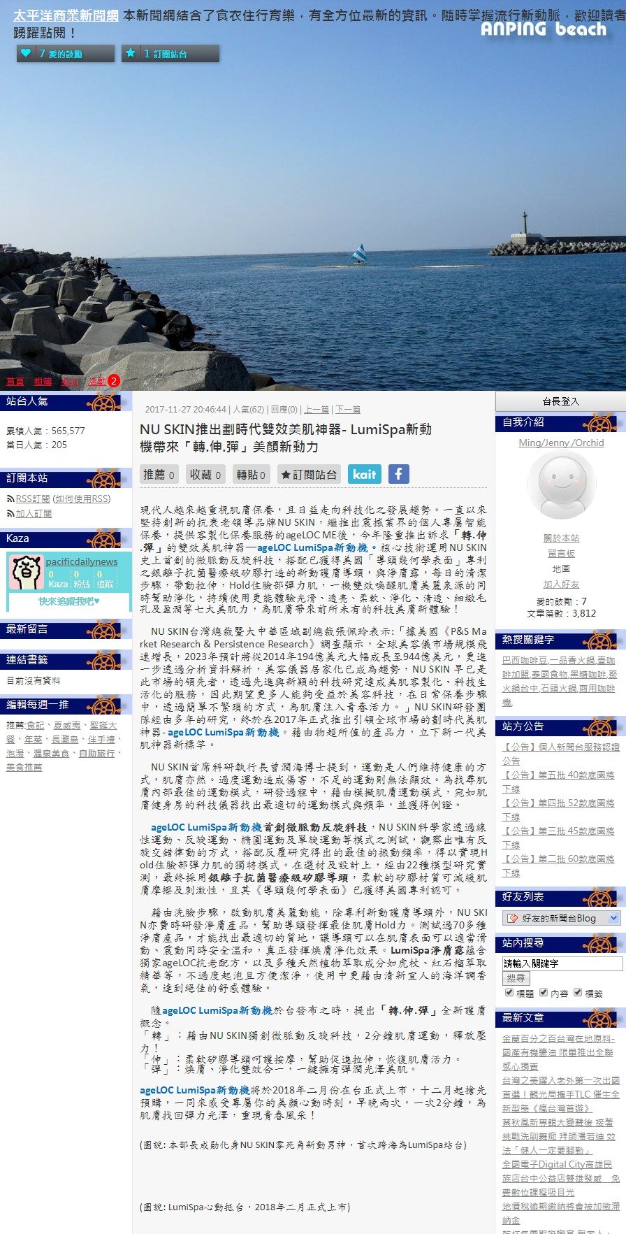 20171127_太平洋商業新聞網_NU SKIN推出劃時代雙效美肌神器- LumiSpa新動機帶來「轉.伸.彈」美顏新動力