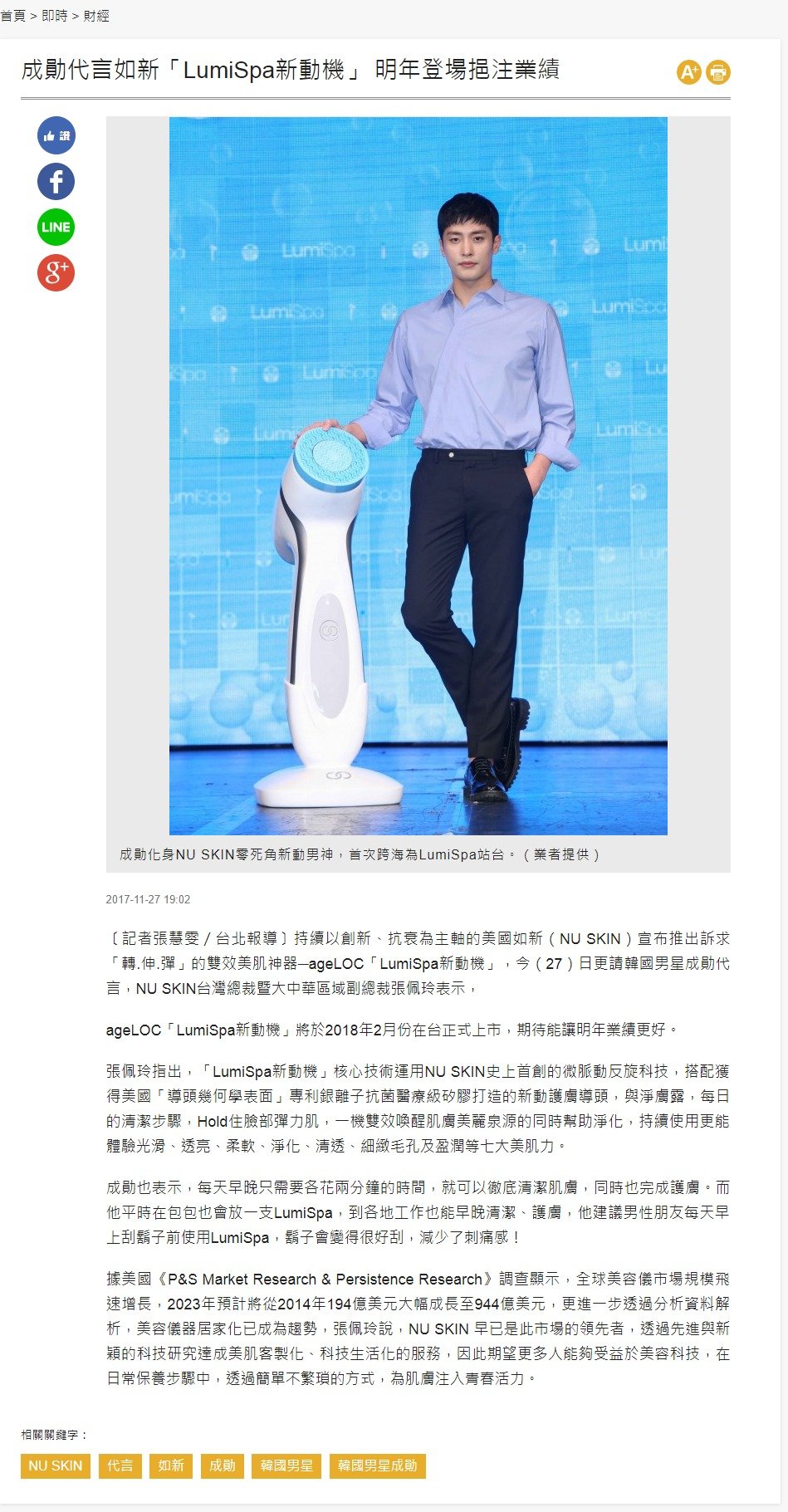 20171127_自由時報電子報_成勛代言如新「LumiSpa新動機」 明年登場挹注業績