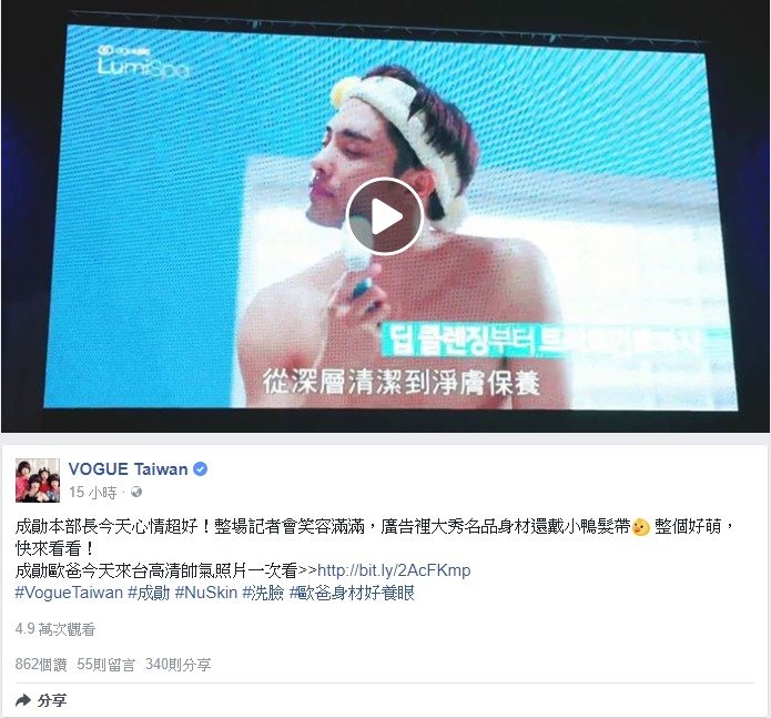 20171127_VOGUE Taiwan(FB)_成勛本部長今天心情超好!整場記者會笑容滿滿,廣告裡大秀名品身材還戴小鴨髮帶