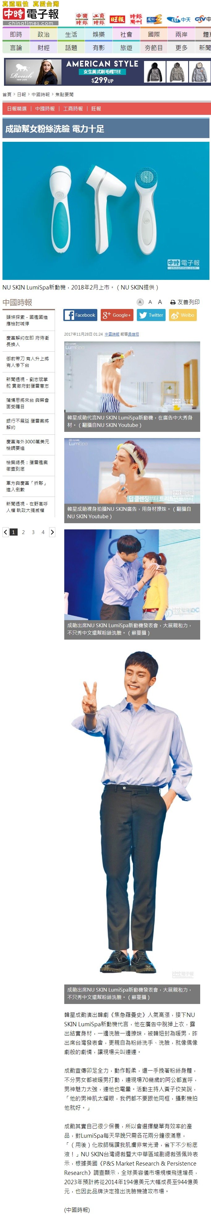 20171128_中國時報_成勛幫女粉絲洗臉 電力十足--代言洗臉機好盡責