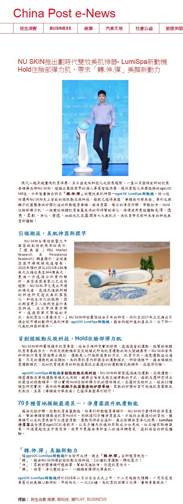 20171128_China Post e-News_NU SKIN推出劃時代雙效美肌神器- LumiSpa新動機 Hold住臉部彈力肌,帶來「轉.伸.彈」美顏新動力