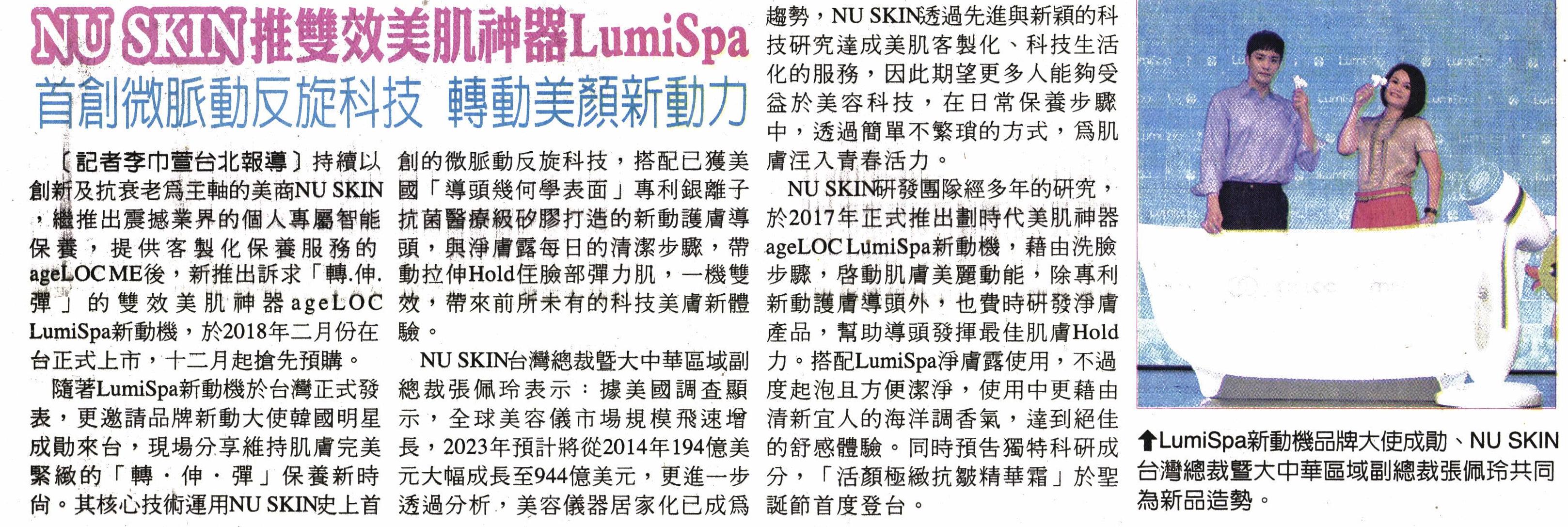 20171129_臺灣時報_NU SKIN推雙效美肌神器LumiSpa--首創為脈動反旋科技 轉動美顏新動力