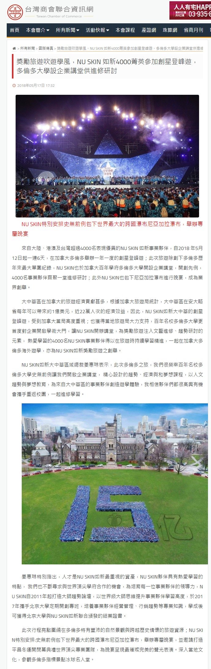 20180517_台灣商會聯合資訊網_獎勵旅遊吹遊學風,NU SKIN 如新4000菁英參加創星登峰遊,多倫多大學設企業講堂供進修研討