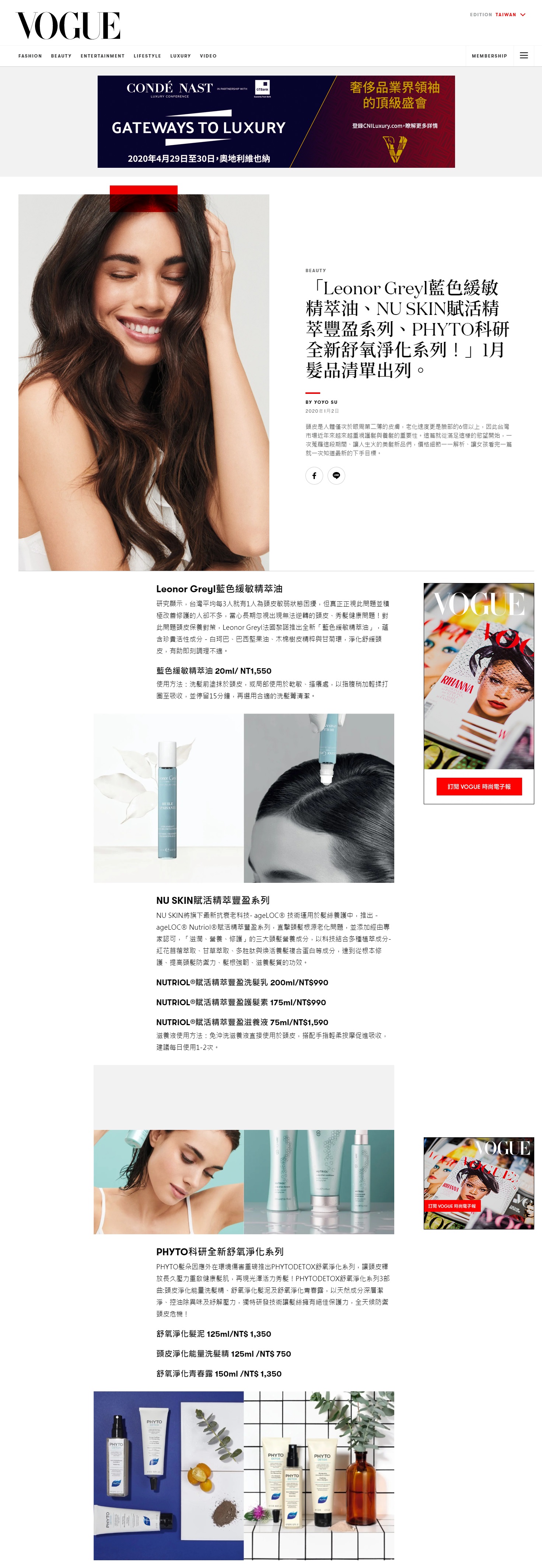 【NU SKIN】20190102_VOGUE_「Leonor Greyl藍色緩敏精萃油、NU SKIN賦活精萃豐盈系列、PHYTO科研全新舒氧淨化系列!」1月髮品清單出列。