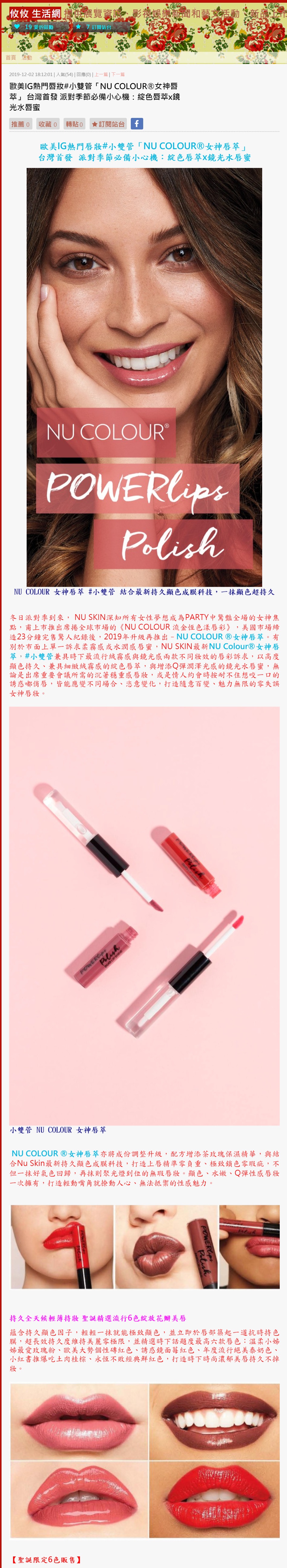 【NU SKIN】20191202_攸攸生活網_歐美IG熱門唇妝 #小雙管「NU COLOUR女神唇萃」台灣首發 派對季節必備小心機:綻色唇萃x鏡光水唇蜜