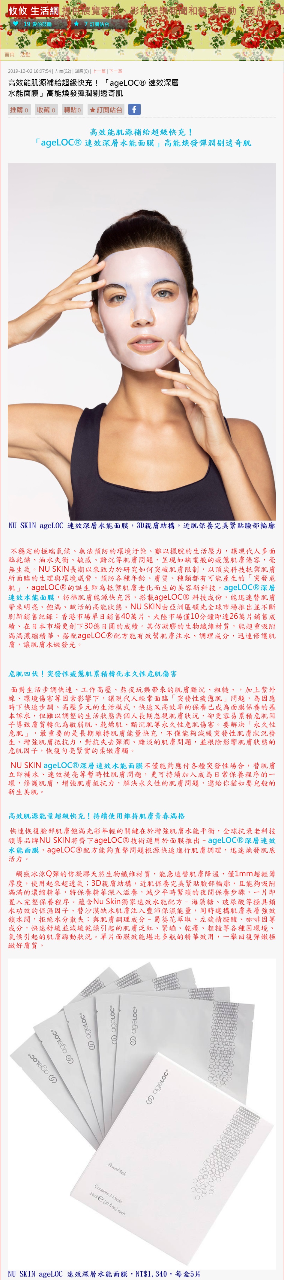 【NU SKIN】20191202_攸攸生活網_高效能肌源補給超級快充!「ageLOC 速效深層水能面膜」高能煥發彈潤剔透奇肌