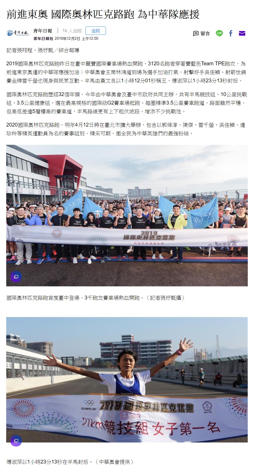 【NU SKIN】20191202_青年日報_前進東奧 國際奧林匹克路跑 為中華隊應援