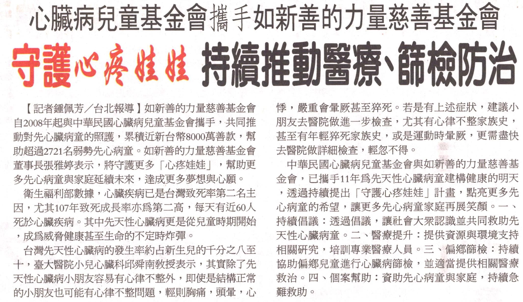 【NU SKIN】20191227_台灣新生報_09_守護心疼娃娃 持續推動醫療、篩檢防治 - 心臟病兒童基金會攜手如新善的力量慈善基金會