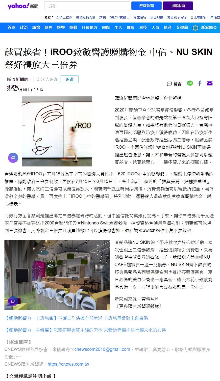Yahoo新聞_越買越省!iROO致敬醫護贈購物金 中信、NU SKIN祭好禮放大三倍券