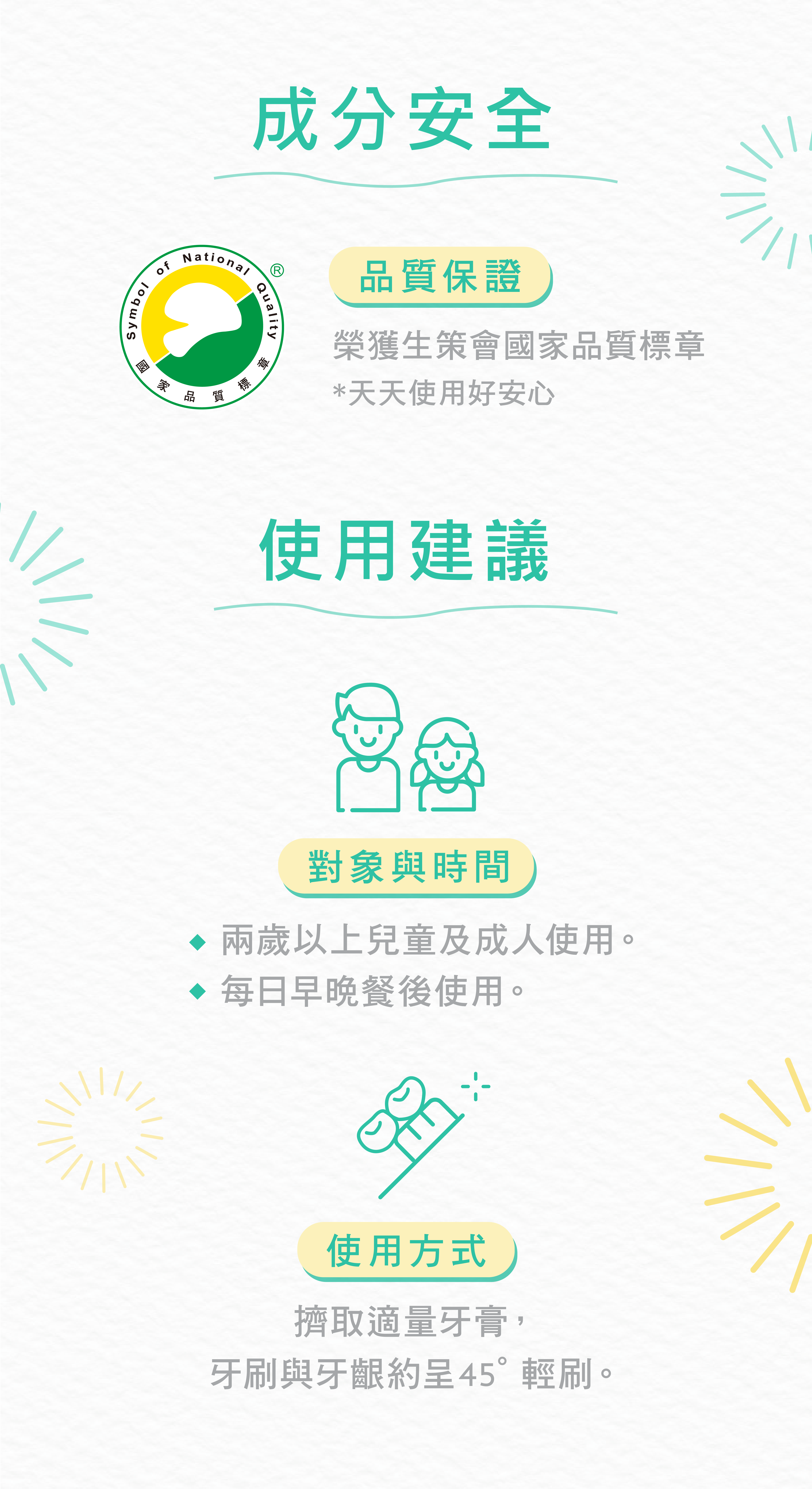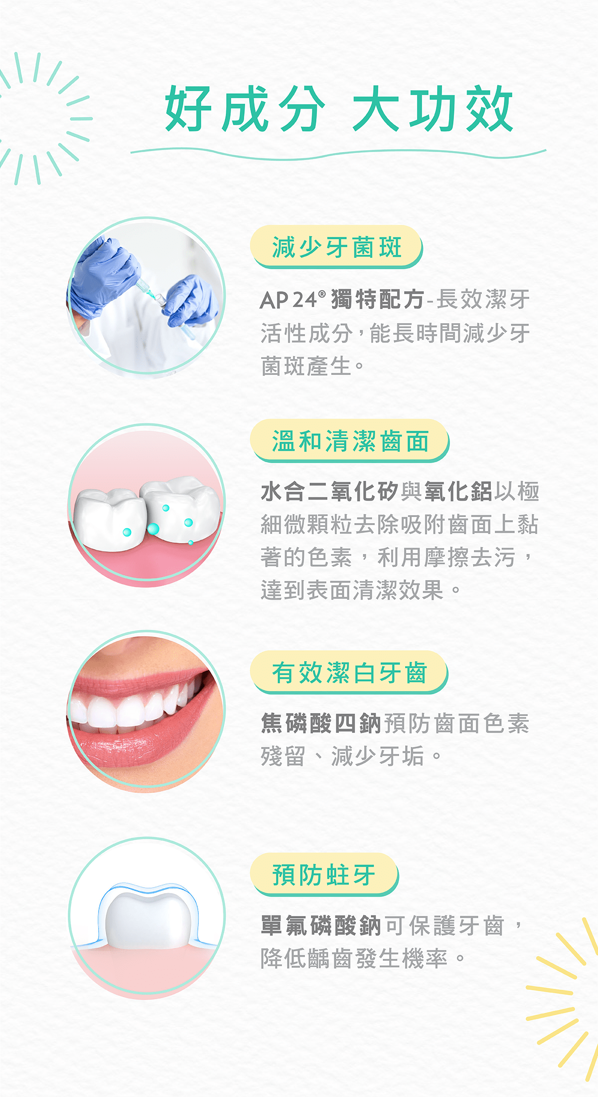 全成分:WATER (AQUA), HYDRATED SILICA, SORBITOL,ALUMINUM HYDROXIDE, GLYCERIN, TETRASODIUMPYROPHOSPHATE, PEG-12, SODIUM MONOFLUOROPHOSPHATE(0.1% F-), DIMETHICONE, POLOXAMER 338, POLOXAMER 407, CELLULOSE GUM, SODIUM LAURYLSULFATE, FLAVOR (AROMA), SODIUM SACCHARIN,TITANIUM DIOXIDE (CI 77891).